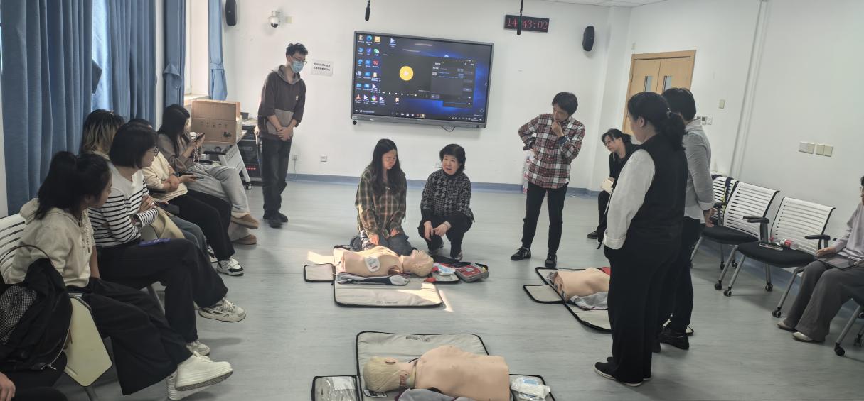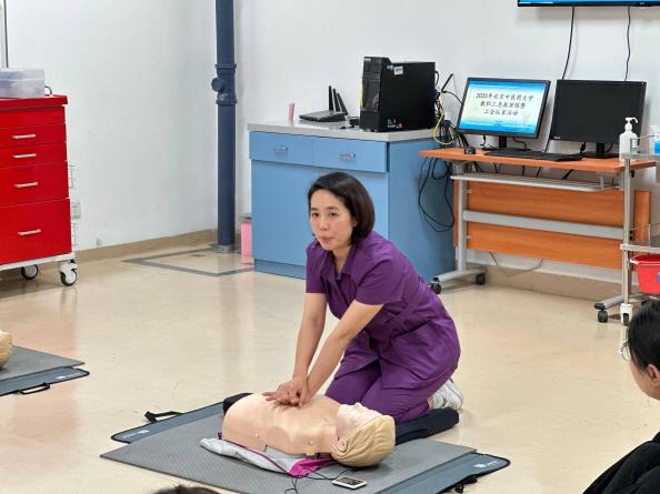 李雁院长担任和平街校区培训场的主讲,围绕心肺复苏人文背景、单人徒手心肺复苏操作规范及自动体外除颤器(AED)的使用方法进行系统讲授。培训内容紧扣《中国心肺复苏指南》相关要求,突出科学性与实操性。在良乡校区,护理学院杨丽丽老师、崔昕雅老师凭借丰富教学经验和扎实的专业功底,采用“理论讲解+实操演示+情景模拟”三位一体的教学模式,结合真实急救案例,对心肺复苏(CPR)标准操作流程进行细致拆解。从胸外按压的深度、频率,到人工呼吸的姿势配合与气流控制,两位老师逐一明确动作规范与关键禁忌;针对自动体外除颤器(AED)的实战应用,她们通过设备拆解演示与模拟操作,清晰讲解开机启动、电极片规范粘贴、除颤时机判断等核心步骤,确保每位参训者都能理解操作逻辑。