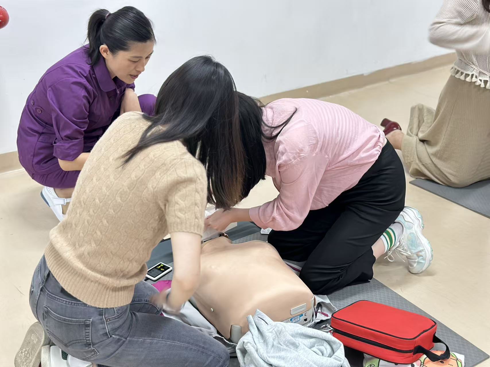 参训教职工全程保持高度专注,在理论学习阶段主动举手提问,围绕救护原理、风险规避要点与讲师深入交流;进入实操练习环节,大家更是积极参与,在两位老师的一对一指导下反复练习动作细节——从按压姿势的调整,到呼吸配合的节奏把控,力求每个操作步骤都精准规范。通过沉浸式学习与实操打磨,教职工们不仅掌握了心肺复苏与AED使用的核心技能,更显著提升了在紧急情况下实施科学救护的信心与能力。